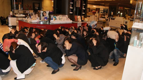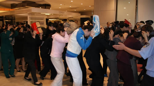 國(guó)芳百貨員工按照防震緊急避險(xiǎn)的標(biāo)準(zhǔn)動(dòng)作進(jìn)行演習(xí)