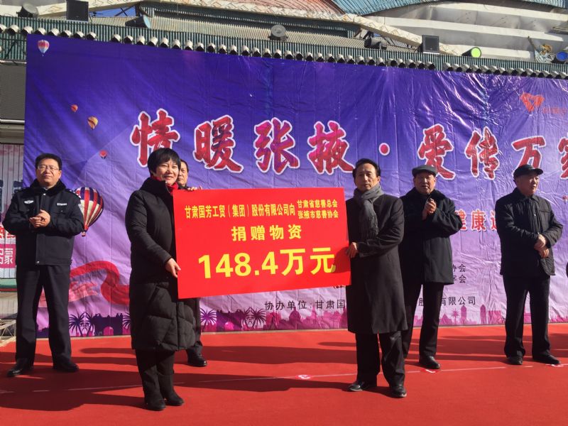 2019年1月11日,甘肅省慈善總會、張掖市慈善協(xié)會、甘州區(qū)慈善協(xié)會以及臨澤縣紅十字會攜甘肅國芳工貿(mào)(集團)股份有限公司在張掖市中心廣場共同舉行“情暖張掖·愛傳萬家”送健康送溫暖活動,將2000套棉衣,2000余套秋衣秋褲,27臺彩電以及300余件小家電合計價值148萬元的過冬物資帶給山丹縣,民樂縣的困難群眾,將2500個醫(yī)藥箱帶給臨澤縣的老人們。此次活動傳導(dǎo)社會幫扶、精準扶貧精神的同時也默默為社會傳導(dǎo)著一份正能量。